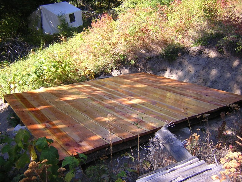 The Tent Platform -- 19 September 09 -- A few years ago Chris helped me dig a spot near the bottom of the north hill, where I was planning to build a cabin. Then this year I got a really nice canvas wall tent from davistent.com, and put it there temporarily. Then I decided that the spot was too dark in the winter, too small, and too unstable for the cabin, and that I'd keep the tent there permanently. Since then, almost every visitor has told me I should put it on a platform. It will help keep it dry, and apparently some people would rather sleep on a wooden floor than on the ground.