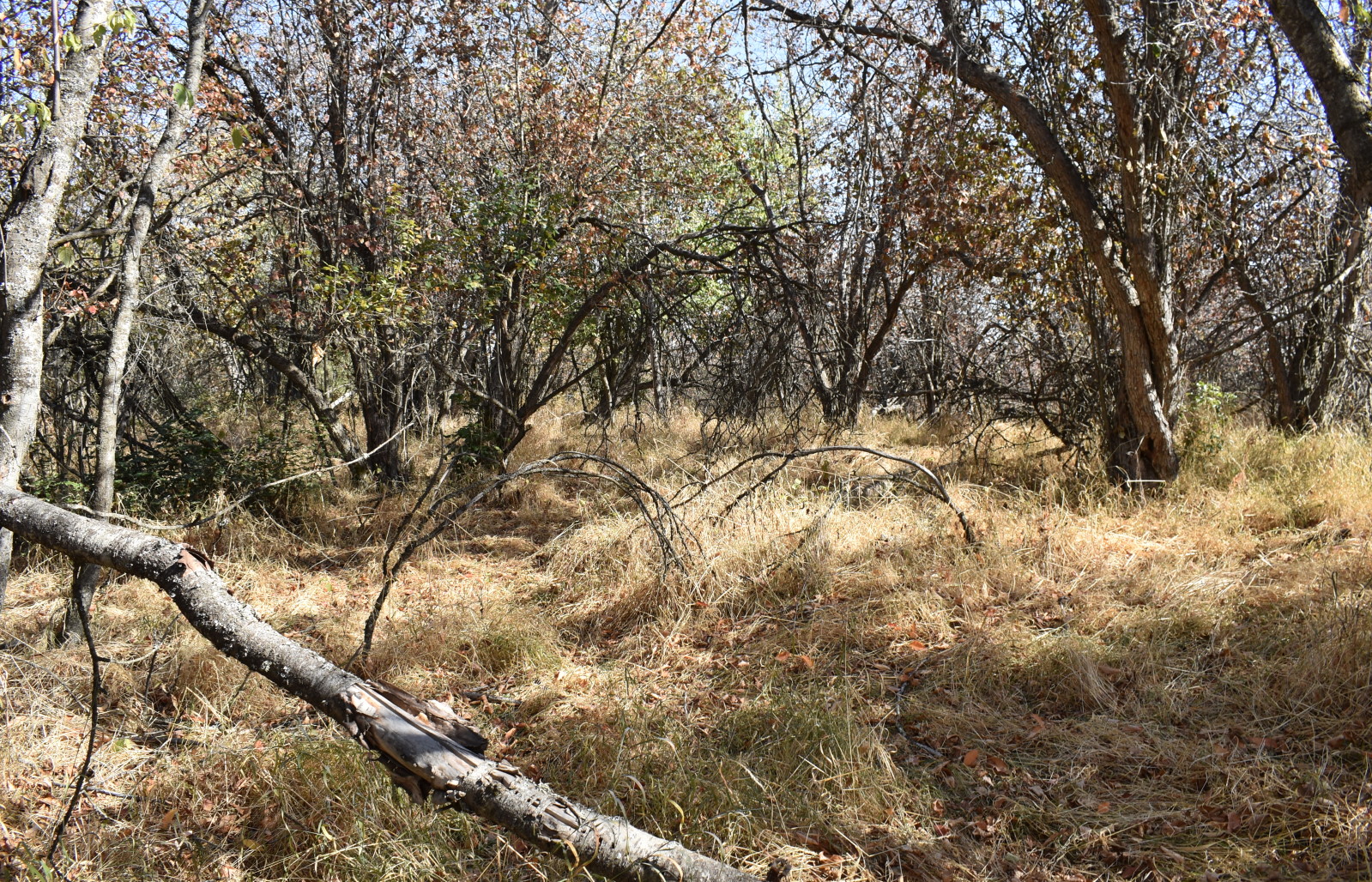 October 2. Yesterday I ate five grams of Psilocybe cubensis and went to a patch of ancient woods at the edge of town. It's called Magpie Forest. Here's a photo I took. The trees are mostly hawthorn, wiry and gnarled. We used to walk across the wheat fields to get there. Now the apartment district has expanded right to the edge of it, and WSU has bought the property as a nature preserve.