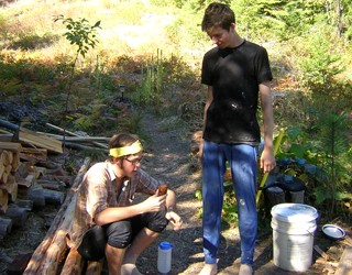 Visitors and Mushrooms -- 10 October 2010 -- These are Ethan and Ian, who hitchhiked across the state to help out. Because they're similar in many ways, at first I got them confused, and I kept thinking of the film Rosencrantz and Guildenstern are Dead. Anyway, I drove them up last Monday, and by the end of the day on Tuesday they were mixing cob and building wall, giving me time to chainsaw enough old cedar for the rest of the structure. The slow drying of the wall limited the speed we could put cob on, so they ended up doing a lot of splitting, and then some unexpected rain on Thursday stalled the project and left about 60 gallons of unapplied cob.