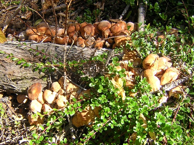 The wet spring, summer, and fall have made this the best year yet for fungi. We went on a mushroom walk and found lots of boletes, but none of the tasty ones, lots of purple-capped Russulas, and some Lactarius rubrilacteus. This photo shows a large fruiting of Armillaria mellea, or honey mushrooms. It took me a while to be sure of the identification because many of the stems had no rings. Then I cooked up a big panful in bacon grease and ate them, while the other guys prudently just took little nibbles. That wood they're growing on is a western redcedar that just recently died. So it appears that honey fungus could be causing the cedar dieoff in the area, although I still think the deeper cause is climate change, which has either weakened the cedars or made an environment more friendly to the fungus.