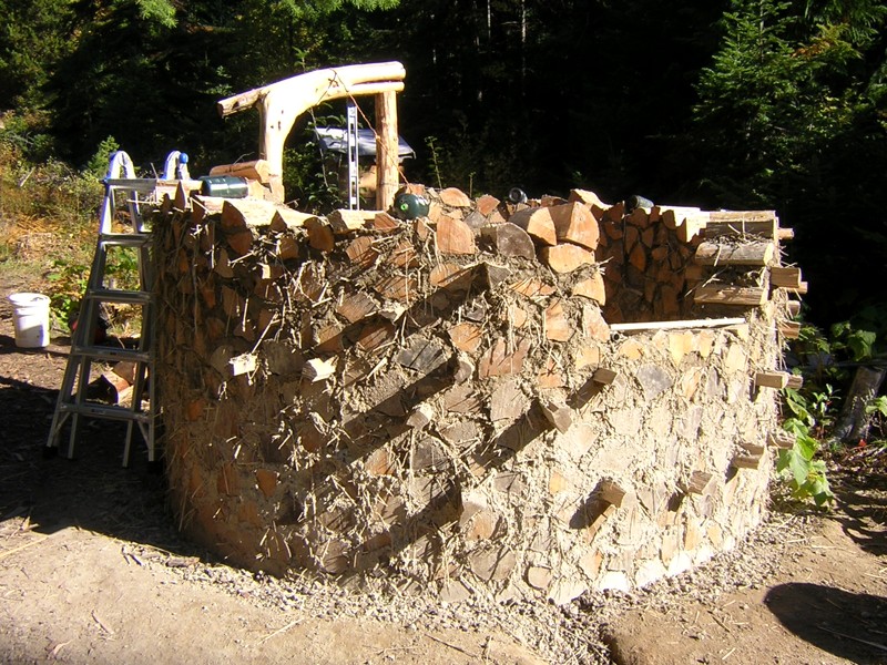 Cobwood has an advantage over cob if you already have a big pile of cordwood. You just stick the wood in the wall and you only have to make half as much cob. But if you have to pick out trees, cut them down, take off the limbs and bark, saw them into rounds, and split them, that's actually more work per volume of wall than digging up and mixing sand and clay. Also, integrating wood and cob takes more work than just piling up cob. Also, it's easy to taper a cob wall, so it gets thinner near the top, but logistically difficult to do this with wood. Also, cordwood doesn't like tight curves, because the ends are spaced too closely on the inside and too far apart on the outside. Also, although everyone says that cobwood can hold up a roof, in practice everyone uses it to fill in between posts and beams. This little structure will be the first example I've seen of a roof-bearing cobwood wall.