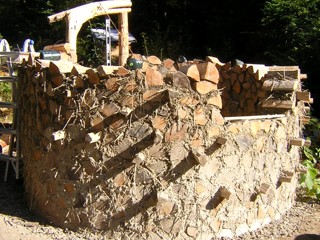 So far I have used about as much sand and clay as I expected, less straw, and much more wood. I think I figured this out last year by doing math on the volumes of the two fallen hemlock trees, and then I forgot it because it was too unpleasant. Yes, the wood in these trees is not enough for this little structure. And I can't kill more trees because the wood needs to spend two summers drying. I'll be able to find enough undecayed old fallen wood to finish the wall, but now I'm thinking...