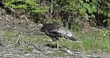 Wildlife! Here's a photo of a young wild turkey walking past my camp. And up on the north hill, with its web built against one of my seedlings, was an unmistakable black widow spider. I had no idea they lived so far north!