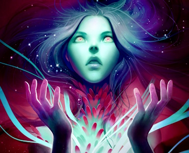 Mycelia Swell Like the Sea is a mid-complexity fungal spirit that's good at corralling invaders and removing blight. All of its powers are things that fungus can really do. Its main power, Ergot Dance Plague, gathers invaders to compulsively dance instead of building and ravaging. It can grow psychedelic mushrooms in the path of explorers, who give up on colonization or even go native. And its scary power is something I thought was fictional when I made the card, but it's real, a "fungal storm" where a great wind carries spores that make people sick. Three of the card images are by my favorite artist, the Spanish painter Remedios Varo.