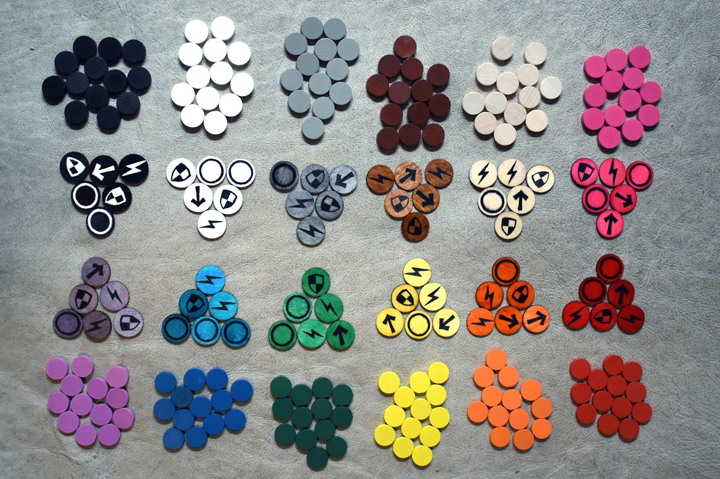 On the right are my presence tokens and reminder tokens. Along the bottom of the image are the six colors of presence tokens that come with the game. Along the top are six more colors that I ordered from a game supplier, colored wooden discs slightly larger (15mm x 4mm) than the originals. In the middle are reminder tokens in all twelve colors, which I made from 20mm unfinished wooden discs, colored with Copic markers and inked with black pens (except the white on black which was black sharpie and white out) then coated with clear satin spray. This was my big project in the winter of Covid.
